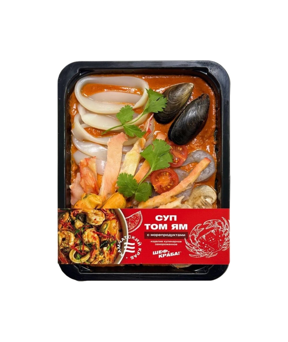 Суп ТОМ ЯМ с камчатским крабом - это тайский острый суп, в котором классические ингредиенты дополнены мясом камчатского краба, а также другими морепродуктами.