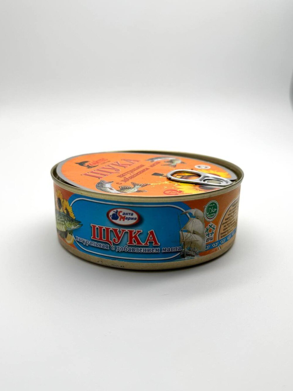 Щука натуральная с добавлением масла в жестяной банке 230 г - это рыбные консервы с отборной щукой в масле, приготовленные с добавлением специй, таких как лавровый лист и перец. Состав включает рыбу, растительное масло, соль и специи.