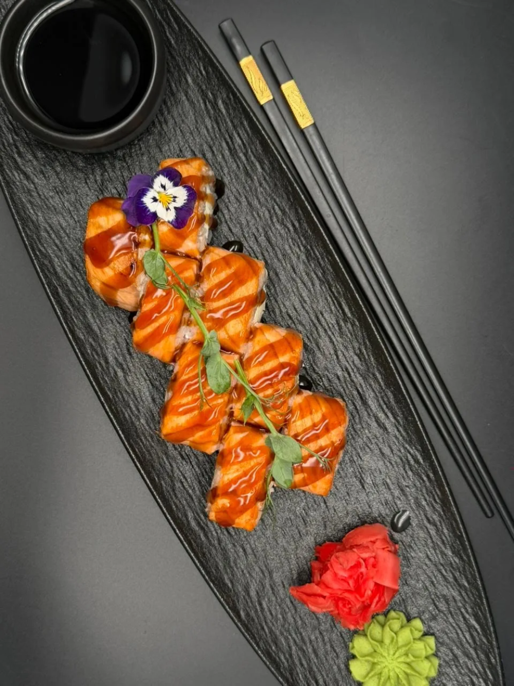 Ролл Филадельфия Гриль Состав: - рис - сыр креметте - лосось - соус унаги