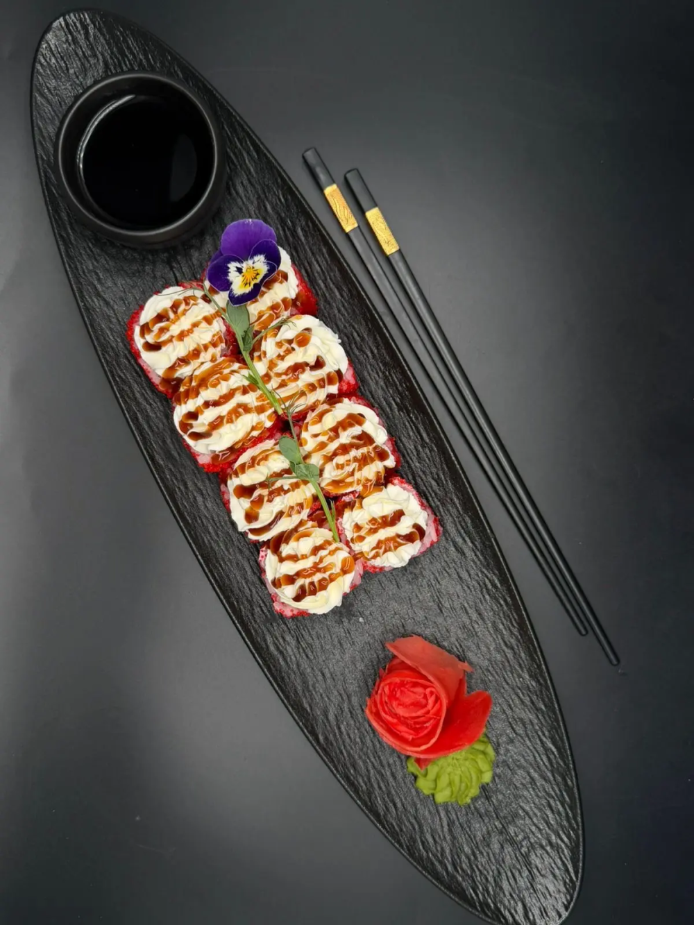 Ролл Дай Сё Состав: - рис - нори - сыр креметте - тигровая креветка - такуан - икра масаго - соус терияки - зленый лук