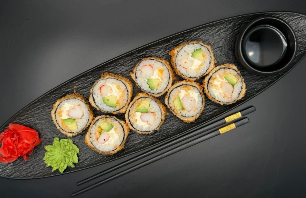 Ролл Темпура с Креветкой Состав: - рис - нори - сыр креметте - креветка в кляре - огурец - спайси соус - икра масаго