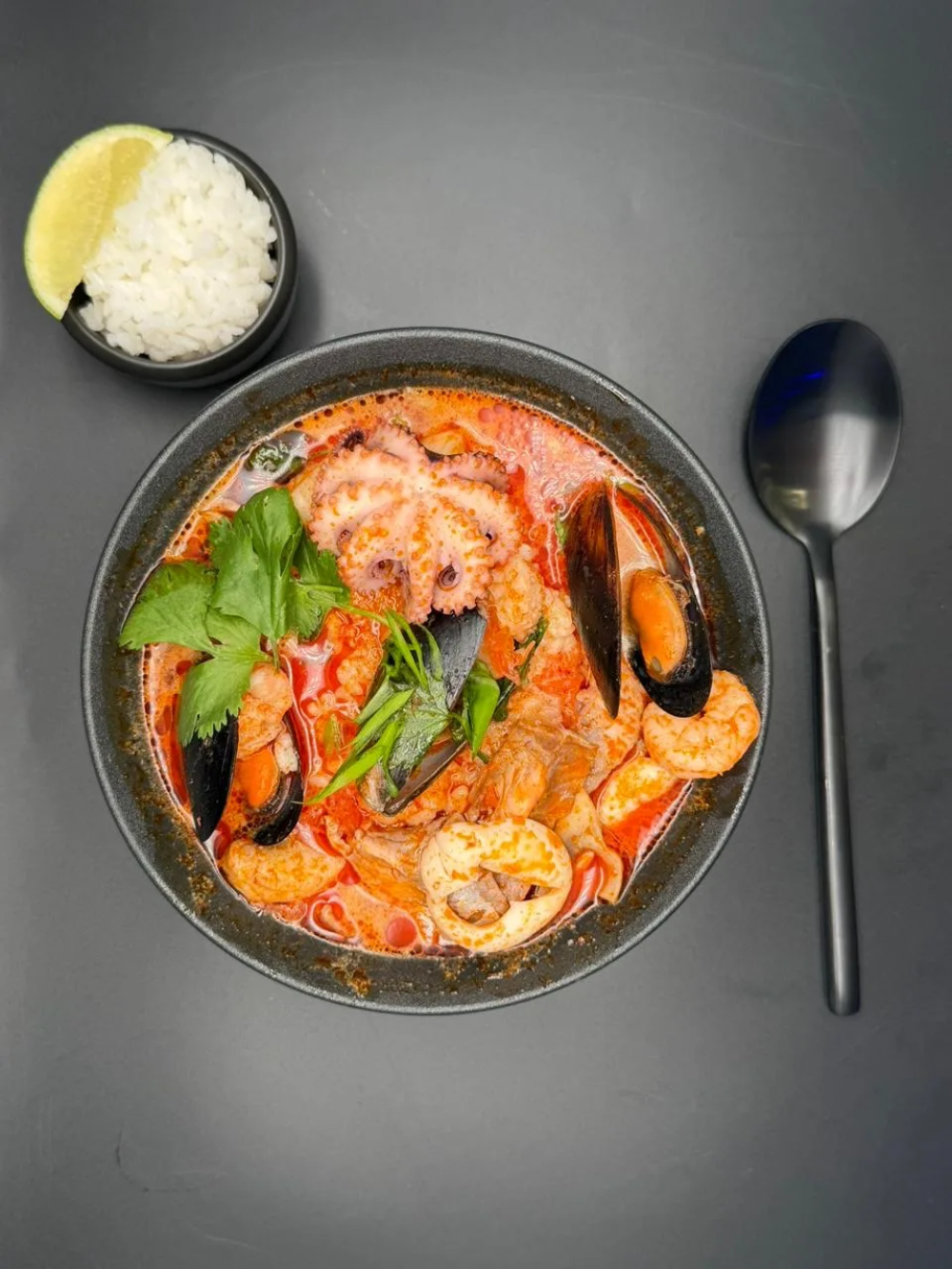 Суп Том-Ям Состав: - бульон том-ям - красный лук - грибы шампиньоны - паста том-ям - томаты черри - кокосовое молоко - осьминог - лосось - кальмар - мидии - креветка - рис - лайм