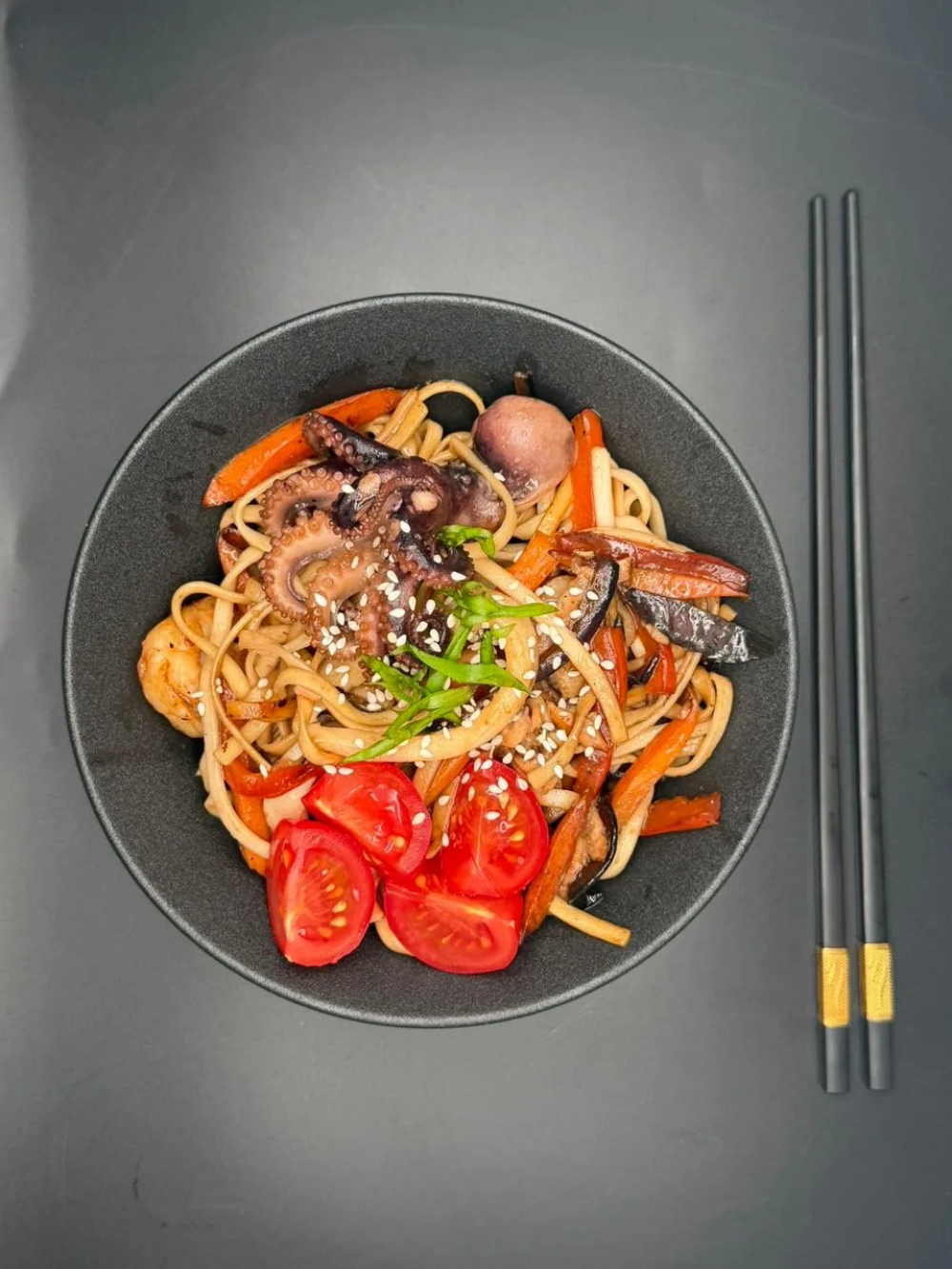 Удон с Морепродуктами Состав: - лапша удон - фасоль стручковая - болгарский перец - морковь - осьминог - кальмар - креветка тигровая - соевый соус - соус терияки