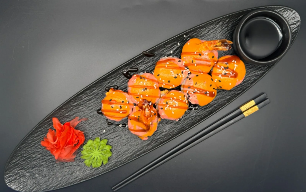 Ролл Хаккайда - Состав: - Рис - Сыр креметта - Помидор - Креветка тигровая темпура - Соус для запекания