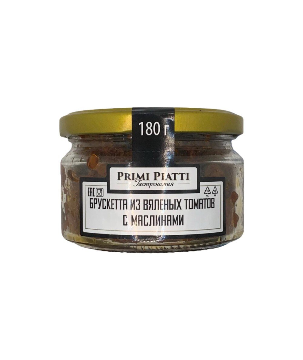 Брускетта "Primi Piatti" с вялеными томатами и оливками - это закуска весом 180 г, состоящая из вяленых томатов, оливок (или маслин),оливкового масел, базилика, чеснока, розмарина, тимьяна, соли и сахара.