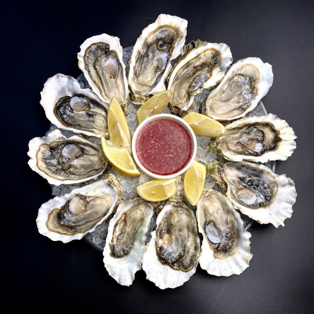 Сет из дальневосточных устриц №3. Подается 12 устриц, дольки лимона.